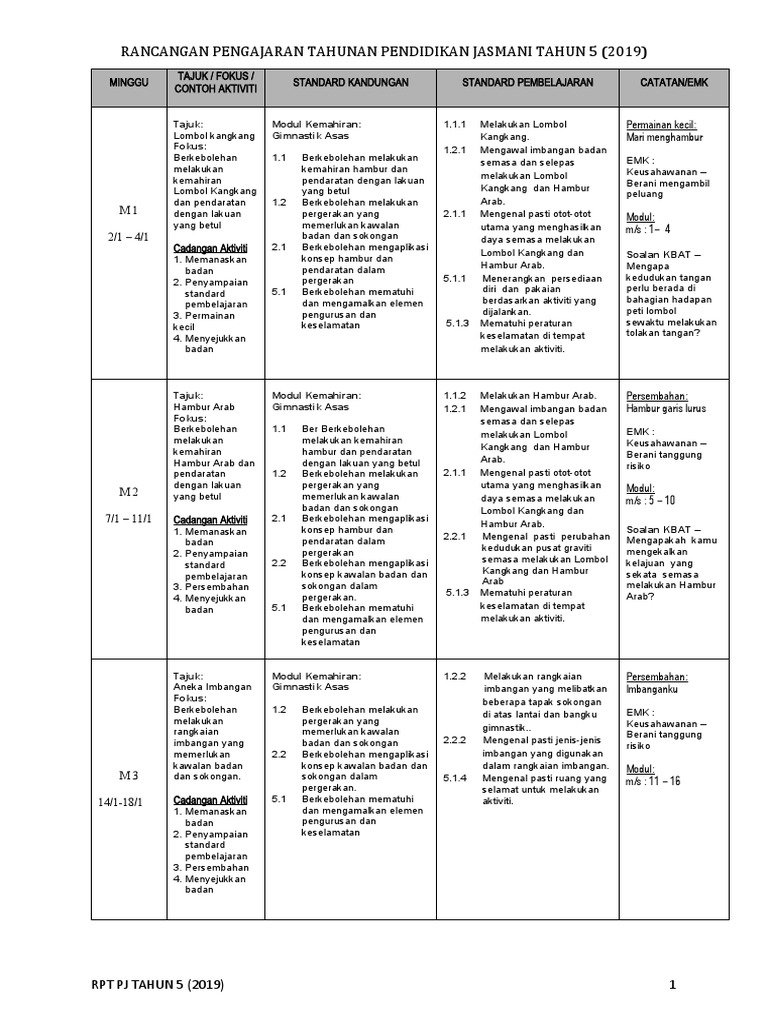 Rancangan pengajaran tahunan pendidikan jasmani tahun 5 2019 rpt pj tahun 5 2018 1 minggu tajuk fokus contoh aktiviti standard kandungan standard pembelajaran catatan emk minggu 1 1 4 januari 2019 tajuk. Rancangan pengajaran ini telah disediakan dan dirangka bagi membolehkan semua kandungan pembelajaran dapat. Koleksi Rancangan Pengajaran Tahunan Rpt 2019 Tahun 5 Kssr Sumber Pendidikan For more information and source see on this link.